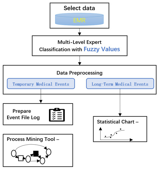 The overall framework of the fuzzy process mining method is shown in Figure 1. First, the raw EMR data are screened, filtered, and cleaned. Second, a multi-level expert classification system with fuzzy values is used to transform the data, and medical events are divided into long-term events and temporary events according to the effectiveness of the clinical pathway. Third, the long-term and temporary medical events are processed separately. Finally, the process model is generated by the process mining tools, and the statistical results are output.