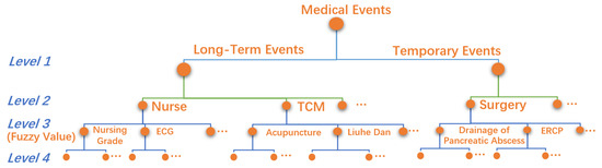It can be seen from the multi-level classification system that the data used for process mining are accurate to low-level medical classes in Level 3, which are the most critical medical classes for clinical pathway mining. To deeply explore the essential details of disease treatment and care, we set a fuzzy value attribute for each Level 3 medical class to represent the degree, probability, or frequency information of medical operations. For example, the “nursing grades” contains “super care”, “primary care”, “secondary care”, and “tertiary care”, so the “value” is set as 1, 0.75, 0.5, or 0.25, respectively, to distinguish the degree of nursing. For medical events without details, the “value” is set as 0 or 1.