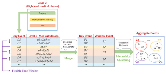Similar Day Events are merged into a Flexible Time Window, and 0–1 fuzzy values are used as the weights of medical classes, representing the probability of their occurrence. Therefore, there will be no information loss. For example, in Figure 3, if D4 {e8, e9, e11} and D5 {e8, e9, e11, e12} are merged into S3 {e8(1.0), e9(1.0), e11(1.0), e12(0.5)}, the fuzzy values reflect the frequency of medical events.