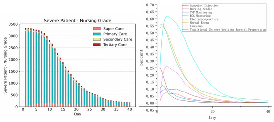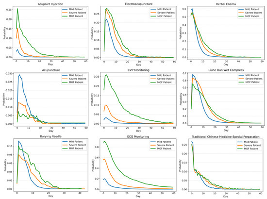 Daily nursing care and TCM treatment belong to long-term medical events. For such events, we mainly study these changes over time after admission. Figure 5 shows the monitoring, TCM treatment, and the probability changes of different nursing grades for patients with severe acute pancreatitis within 40 hospitalization days. It is not difficult to observe that most patients with severe acute pancreatitis experience a hospital stay of 30 days, with a particular focus on the initial two weeks after admission, which constitutes a critical phase in their treatment. For most patients with severe acute pancreatitis, the key observation period falls between two weeks and thirty days after admission. A minority of patients may require re-operation during this observation period.