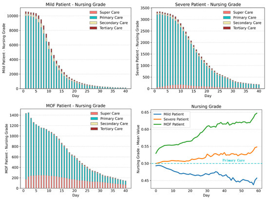 - The hospitalization days of most mild patients, severe patients, and MOF severe patients are 20, 30, and 40 days, respectively, and the nursing grade is mainly primary care. With the aggravation of the disease, the proportion of super care is also increased accordingly. However, with the increase in hospitalization days, the nursing grades of the two types of severe patients show an upward trend, especially for that of MOF severe patients. Mild acute pancreatitis patients can easily recover, while the severe acute pancreatitis patients are likely to get worse or even die within a period.