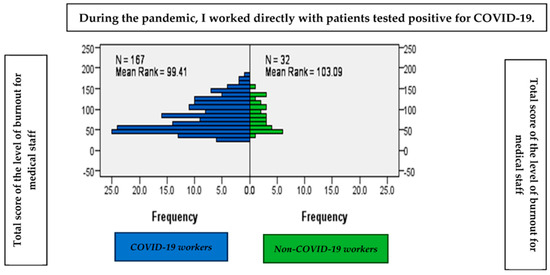 There are no significant differences between those who worked directly with patients with COVID-19 and those who did not work directly with patients with COVID-19 in terms of the average level of burnout, as shown by the Mann–Whitney statistic (U = 2.57; p > 0.05) (Figure 1).