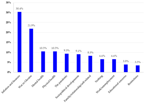 The third largest category in the survey in April 2022 was concerns about “mental health” (10.5%). This category included factors such as uncertainty and anxiety, feeling overburdened or a sense of loneliness, and illness or death in the family, which respondents identified as mental stresses. Compared to the study in winter 2020/2021, in which 9.5% of the participants were found to have mental worries, no improvement in mental health could be observed in 2022. The quantitative results from the study in April 2022, in which mental health indicators were collected, support the current findings. In this context, Humer et al. [14] presented an increased prevalence of depression and no changes in stress, anxiety, and insomnia symptoms compared to the first year of the pandemic. The results also demonstrated that the COVID-19 crisis particularly affected younger adults (<35 years) and people with low incomes. Several previous studies observed increased stress, depression, anxiety, and insomnia related to the outbreak of the COVID-19 pandemic and associated containment efforts [34,35,36]. Moreover, Russia launched a large-scale military attack on Ukraine a few weeks before the start of the April 2022 survey. Limone et al. [37] observed that stress and anxiety among students that were caused by the COVID-19 pandemic were additionally intensified by the Russian–Ukrainian war.