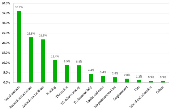 A further main category was subsumed under “No problem/no idea” (2.8%). Some participants (n = 16, 1.7%) said they had no problems; for instance, R 242 said, “I have no problems”. Moreover, n = 11 (1.1%) reported that they had no idea. “Displacement” was referred to by n = 19 (2.0%). R 360 described “trying to suppress the worries”; they generally repressed problems to avoid having to deal with them. “Pets” were also named by n = 11 (1.2%), with dogs being mentioned more often than cats. Some participants also mentioned pets in general.