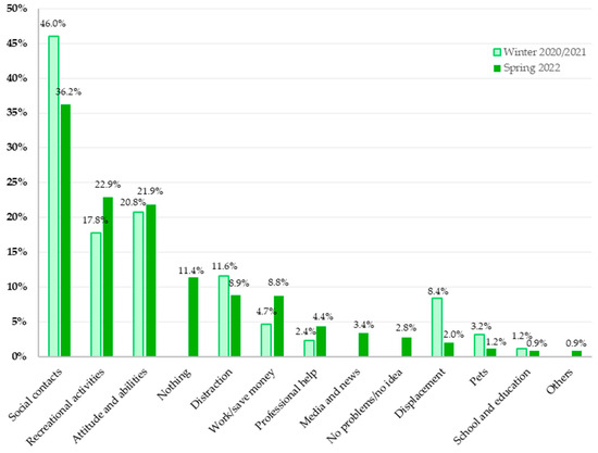 The main sources of support mentioned by the participants fell into the category of social contacts. In both surveys (2020/2021 and 2022), contact with family members and friends was reported most frequently as a resource, although the proportion decreased from 46% in 2020/2021 to 36.2% in 2022. Despite the notable decrease, it is worth highlighting that social contacts were still the most frequently mentioned resource at both time points [22], demonstrating their ongoing importance. In April 2022, recreational activities formed the second largest category, mentioned by 22.9% of participants. Around the turn of the year 2020/2021, a slightly lower proportion (17.8%) reported recreational activities as a source of support, and this category was the third largest one. Differences in both resource categories are likely related to differences in containment efforts at both time points. While during the first survey, several lockdown measures were in place, many restriction measures had been lifted at the time of the second survey. As an example, fitness clubs were open in April 2022, and group sports were not prohibited any longer [9].