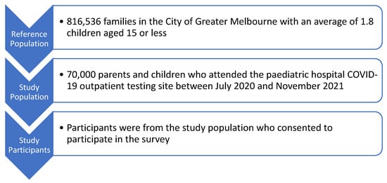 Sample selection: Reference population were people living in the City of Greater Melbourne in 2020/21 = 816,536 families with an average of 1.8 children aged 15 or less (https://www.abs.gov.au/census/find-census-data/quickstats/2021/2GMEL; accessed on 1 June 2022). Study population were people who attended the COVID-19 outpatient testing site between July 2020 and November 2021 (n = 70,000). Study participants were those from the study population who consented to participate in the survey (Figure 1).
