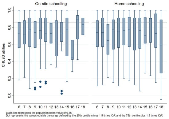 Comparison of median (IQR) CHU9D utility scores for all age groups by on-site or home schooling and by the population norm. Box plot lines represent 25th, 50th and 75th percentiles.