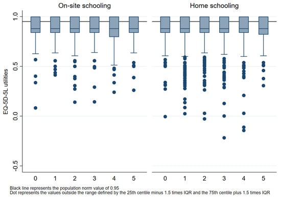 The median value for the on-site schooling group was 0.879 (Q1 0.837; Q3 1.000), and for the home schooling group, it was also 0.879 (Q1 0.837; Q3 1.000). There was no evidence of a difference in median EQ-5D-5L score between the two groups after adjusting for age, gender, symptoms of COVID and chronic conditions (adjusted difference in median 0, 95% CI −0.002 to 0.002, p = 1.000). For parents of children, the median quality of life for the current cohort (0.897) was less than the median quality of life of the corresponding pre-pandemic population norms (0.95). The median quality of life for parents of children across all child age groups is presented in Figure 3.
