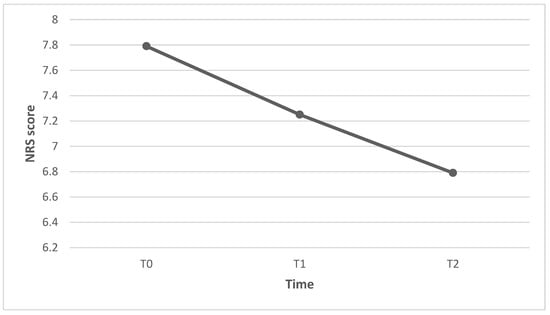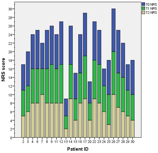 The primary outcome measures perceived intensity of pain and NP evaluated with the NRS and the NPSI, respectively. The mean pain intensity score was 7.79 at baseline (T0), 7.25 after 3 weeks (T1), and 6.79 after 6 weeks (T2). The reduction in pain intensity was significant from T0 to T1 (Z = −2.31; p = 0.021), from T0 to T2 (Z = −2.54; p = 0.011), and from T1 to T2 (Z = −2.00; p = 0.46) (Figure 1). Individual patients’ pain intensity scores are presented in Figure 2.