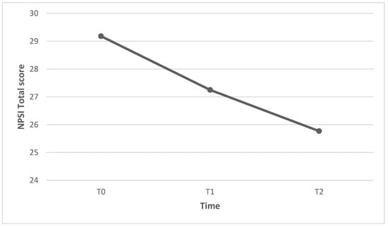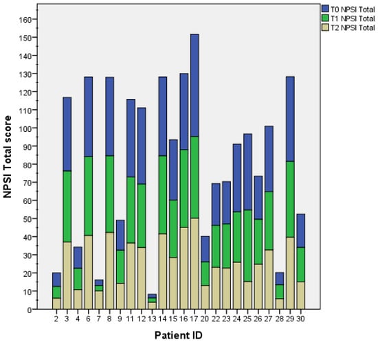 The mean NPSI total score was 29.18 at baseline (T0), 27.25 after 3 weeks (T1), and 25.77 after 6 weeks (T2). The reduction in the NPSI total score was significant from T0 to T1 (Z = −2.26; p = 0.024) and from T0 to T2 (Z = −2.98; p = 0.003), but not significant from T1 to T2 (Z = −1.83; p = 0.68) (Figure 3). Individual patients’ NPSI total scores are presented in Figure 4.