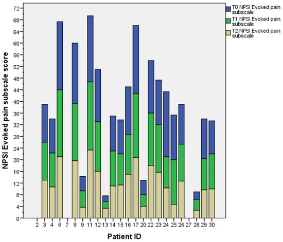 The mean score of the NPSI subscale “evoked pain” was 12.38 (±7.76) at baseline (T0), 11.56 (±7.23) after 3 weeks (T1), and 10.68 (±7.15) after 6 weeks (T2). The reduction in the NPSI subscale “evoked pain” score was significant from T0 to T2 (p = 0.048), but not significant from T0 to T1 (p = 0.376) nor from T1 to T2 (p = 0.213) (Figure 5). Individual patients’ NPSI evoked pain subscale scores are presented in Figure 6.