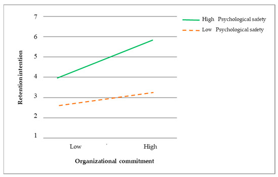 This study analyzed how psychological safety affects the relationship between “organizational commitment and retention intention” using hierarchical regression analysis. The results are presented in Table 6. In regression model M3, “organizational commitment × psychological safety”, the explained variance (R2) increased to 0.268, signifying a 0.018 change in explained variance (ΔR2). The regression coefficient was significant (β = 0.639; p < 0.001), indicating a moderate effect of psychological safety on “organizational commitment and retention intention”. Furthermore, the sample was divided into two groups based on high and low levels of psychological safety (using the mean as the cutoff point).