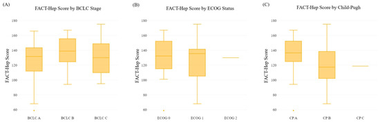Boxplots of the association between the FACT-Hep total score and (A) the BCLC stage categories, (B) the ECOG performance status, and (C) the CP class. Abbreviations: FACT-Hep, Functional Assessment of Cancer Therapy-Hepatobiliary; BCLC, Barcelona Clinic Liver Cancer; CP, Child–Pugh; ECOG, Eastern Cooperative Oncology Group.