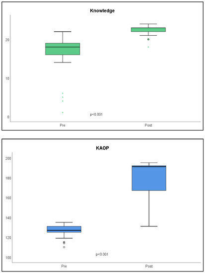 Scores obtained in the knowledge and attitudes towards older people variables before and after the training program. KAOP = Kogan’s attitudes towards older people. Knowledge: pre-M = 15.96; post-M = 22.36. KAOP: pre-M = 126.28; post-M = 175.52.