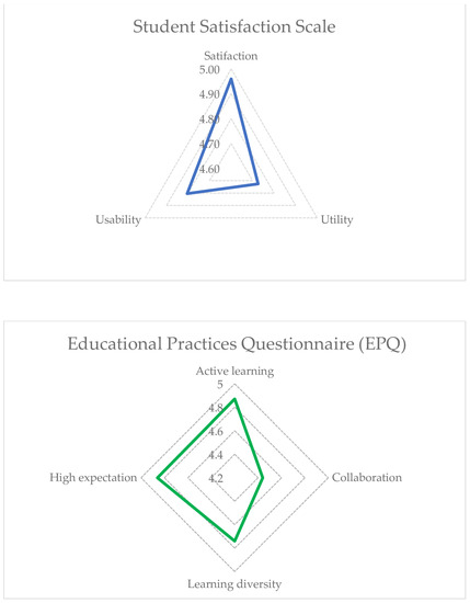 Scores obtained in the Student Satisfaction Scale and the Educational Practices Questionnaire.