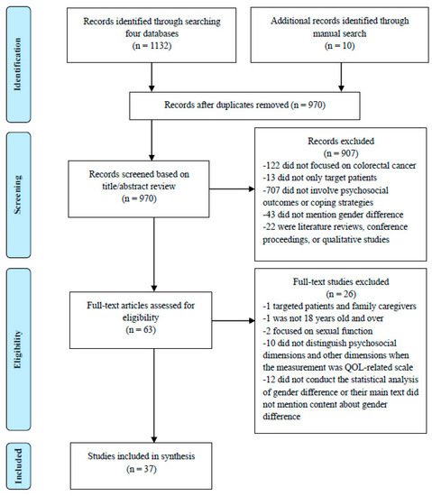 APA StyleZhou, J., Wang, Z., Chen, X., & Li, Q. (2023). Gender Differences in Psychosocial Outcomes and Coping Strategies of Patients with Colorectal Cancer: A Systematic Review. Healthcare, 11(18), 2591. https://doi.org/10.3390/healthcare11182591