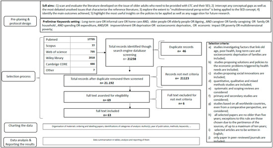 The following articles were chosen for inclusion on the basis of these selection criteria: (a) those focused on the relationship between poor health and the aging process, long-term care needs, and the socioeconomic deprivation of chronically ill older people and their families; (b) those proposing solutions to the economic problems triggered by health needs; (c) those proposing social innovation policies; (d) those based on a specific method (quantitative or qualitative) or mixed methods (i.e., either of these categories); (e) both surveys and systematic or scoping reviews; (f) those referring to “primary” or “secondary” studies; (g) those conducted in high-income or low- and middle-income countries (i.e., either one of the latter two; articles based on a comparative perspective were also included); (h) those that were published within the past five years (exceptions to this rule were articles chosen due to the relevance of the sources, published within the past ten years as a maximum); (i) those written in English; and (j) those published in peer-reviewed journals. Two researchers (GC and RM) independently screened the extracted items based on the titles and abstracts. Ultimately, 21,131 articles were excluded for failing to meet the criteria. Therefore, a total of 69 articles were provisionally selected. A second check of excluded and included papers was undertaken, including a total of 63 papers in the ScR. No other references were found by manual searching or by analyzing the references of included articles. Appendix A contains the complete list of selected papers, including their bibliographic data.