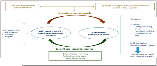 The relationship between LTC care needs and SED risk is composed of three main elements: (a) care needs, often expressed through the identification of a specific target of study; (b) socioeconomic deprivation, understood as a multidimensional factor; and (c) the characteristics of the relationship between these two factors.