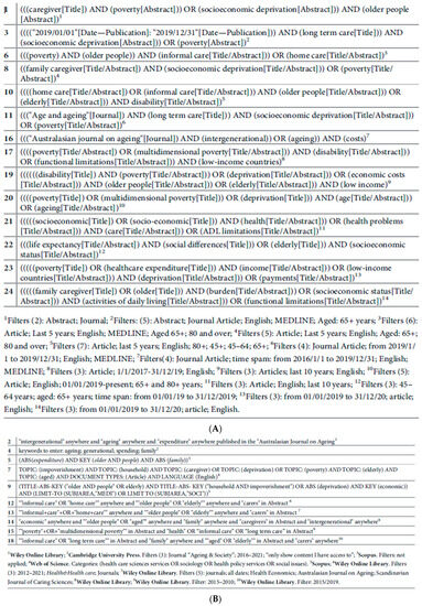 As shown in Figure 2, the authors identified a set of keywords to cover the chosen conceptual framework’s concepts and relationships. As detailed in the protocol paper [33], the authors searched various databases using the keywords defined in the pre-planning phase that were strictly related to the abovementioned objective. Thirteen keywords were included in the first set of searches: “long-term care”, “older people”, “elderly”, “aged”, “caregiver(s)”, “family caregiving”, “impoverishment”, “deprivation”, “socioeconomic deprivation”, “economic”, “economic impact”, “poverty”, and “multidimensional poverty”. After the initial exploratory searches, additional keywords were added progressively in order to refine the search: “household”, “expenditure”, “healthcare expenditure”, “spending”, “payments”, “economic impoverishment”, “costs”, “burden”, “socioeconomic status”, “socioeconomic/socioeconomic”, “household”, “social differences”, “informal care”, “care”, “carers”, “(inter)generational”, “activities of daily living”, “ADL limitations”, “functional limitations”, “disability”, “life expectancy”, “health”, “health problems”, “income”, “low-income”, and “low-income countries”. Forty-one keywords were used since they were deemed congruent with the conceptual framework (Figure 2).