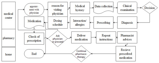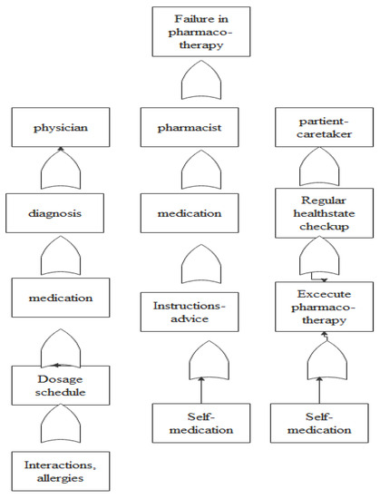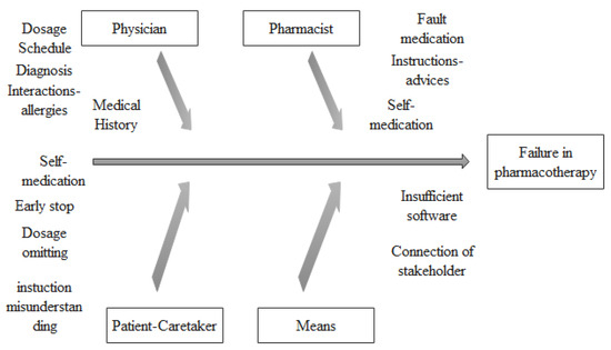 To detect failure points, an accurate mapping of the pharmacotherapy process on a flowchart was created (shown in Figure 1). Additionally, fault tree analysis (FTA) (Figure 2) was conducted to help locate errors and a cause–effect diagram (Figure 3) was created to identify the main failures related to the process [32]. The above analysis revealed that (i) patient compliance, (ii) treatment, (iii) drug–drug interactions, and (iv) errors in prescribing are system failure points that warrant further investigation.
