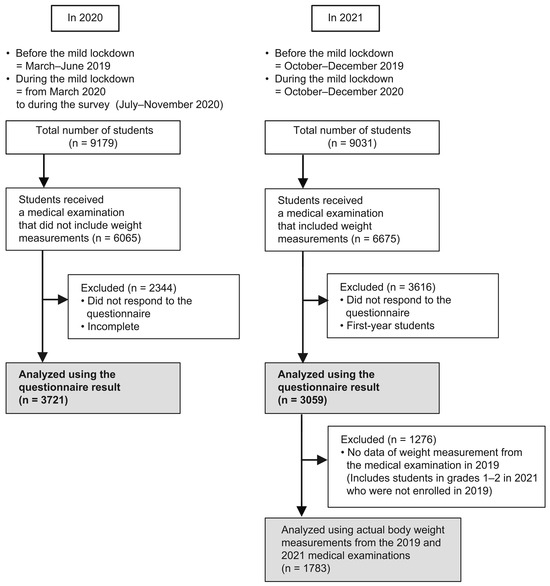 Section 2 included questions regarding changes in weight and lifestyle before and during the mild lockdown in 2020 and 2021. In the evaluation year 2020, the periods of before and after mild lockdown were March–June 2019 and from March 2020 to July–November 2020 (during survey), respectively. In the evaluation year 2021, the periods of before and after mild lockdown were October–December 2019 and October–December 2020, respectively. For each lifestyle factor in Sections 3–6, we evaluated the daily lifestyle of individuals before and during the mild lockdown.