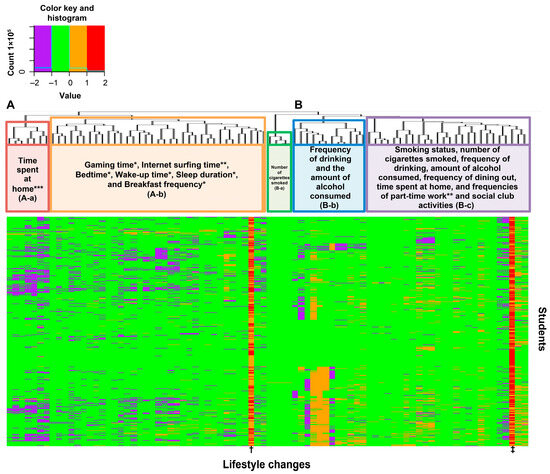 Heatmap showing the clustering of lifestyle changes before and during the mild lockdown. The vertical axis represents students, while the horizontal axis represents each cutoff for lifestyle changes. Purple indicates a change from above to below the cutoff. Light green indicates no change (i.e., above to above or below to below the cutoff). Orange indicates a change from below to above the cutoff. *: Lifestyle factors found to be associated with weight gain using Fisher’s exact test across all students; ** and *** indicate lifestyle factors found to be associated with weight gain using Fisher’s exact test across male students and female students, respectively. we observed two major groups (A and B) of change in lifestyle factors as well as two and three subgroups of factors under groups (A) (A-a–A-b) and (B) (B-a–B-c), respectively. †: sex. ‡: absence of dramatic lifestyles changes. Regarding sex, orange represents male students and red represents female students. For overall lifestyle change, orange indicates dramatic change and red indicates no dramatic change.