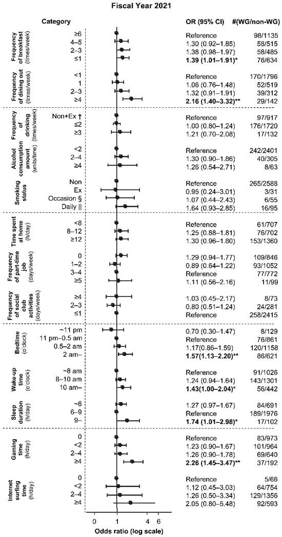 Relationship between weight gain of ≥3 kg and each lifestyle factor during the mild lockdown in all students. * p < 0.05; ** p < 0.01. † Non: nondrinker or nonsmoker, Ex: ex-drinker or ex-smoker. § Occasion: occasional smoker. || Daily: daily smoker. OR: odds ratio. WG: weight gain group (students who responded that they experienced a weight gain of ≥3 kg in the 2021 survey about weight change from before to during the mild lockdown). Non-WG: non-weight-gain group (students who were excluded in the WG group from the total, i.e., those who responded that they experienced a weight gain of <3 kg, no weight change, weight loss of <3 kg, or weight loss of ≥3 kg in the 2021 survey about weight change from before to during the mild lockdown). Error bars indicate 95% confidence intervals.