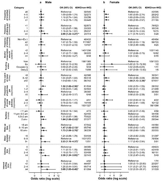 Relationship between weight gain of ≥3 kg and each lifestyle factor during the mild lockdown in (a) male students and (b) female students. * p < 0.05; ** p < 0.01. † Non: nondrinker or nonsmoker, Ex: ex-drinker or ex-smoker. § Occasion: occasional smoker. || Daily: daily smoker. OR: odds ratio. WG: weight gain group (students who responded that they experienced a weight gain of ≥3 kg in the 2021 survey about weight change from before to during the mild lockdown). Non-WG: non-weight-gain group (students who were excluded in the WG group from the total, i.e., those who responded that they experienced a weight gain of <3 kg, no weight change, weight loss of <3 kg, or weight loss of ≥3 kg in the 2021 survey about weight change from before to during the mild lockdown). Error bars indicate 95% confidence intervals.