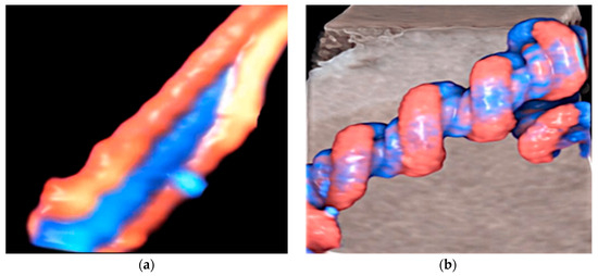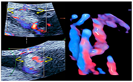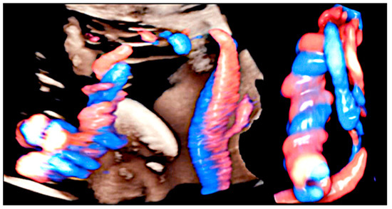 Umbilical cord displayed in HDlive Flow. Measurement of sonographic umbilical cord index (UCI): 1/one coil. One coil corresponds to a complete coil of 360° of the umbilical vessels around each other measured in centimeters. Basically, the distance between the inner edge of the umbilical artery wall to the outer edge of the arterial wall itself should be measured up to the next spiral (left–right arrow). Interestingly, in twin–twin transfusion syndrome, the recipient usually displays a hypercoiled cord, probably having been developed as a protective mechanism against volume overload [24] (Figure 2 and Figure 3).