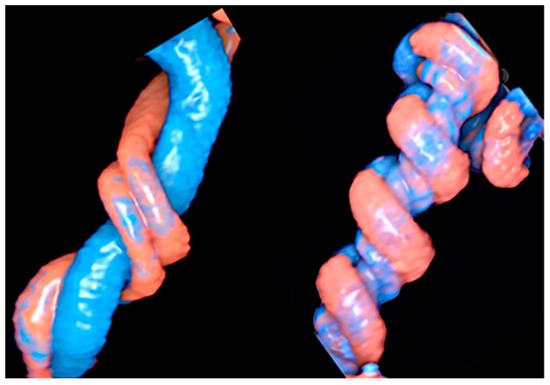 Hypercoiling is frequently associated with a long cord, and as an expression of compromised fetal blood flow, fetal vascular malperfusion (FVM) is usually seen during placental examination. These histological features include thrombosis in fetal vessels, avascular villi, villous-stromal karyorrhexis, and normoblastemia [14,20]. Massive fibrin deposition has also been observed [21]. Though a hypercoiled cord has been reported as a recurrent finding, no definitive genetic cause has been established [20,21,22]. Although the etiology of abnormal cord coiling is still unknown, hemodynamic changes and fetal movements may be a cause. Short cords and fewer coils are found in conditions associated with reduced fetal movements such as skeletal dysplasia or muscular disorders, as well as intrauterine physiological space limitation (i.e., oligohydramnios, twin pregnancy, prolonged rupture of membranes) [20]. In long and hypercoiled cords, Poiseuille’s equation is applied, considering that blood flow speed is inversely proportional to the vascular length [23]. Therefore, excessive blood flow can possibly be regulated over time by lengthening the hypercoiling of the cord as an adaptive condition. Interestingly, in twin–twin transfusion syndrome, the recipient usually displays a hypercoiled cord, probably having been developed as a protective mechanism against volume overload [24] (Figure 2).