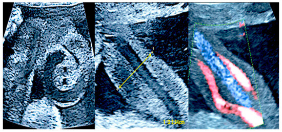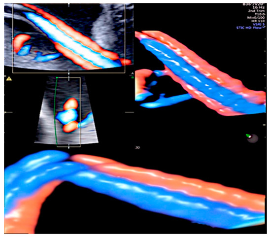 Single umbilical artery (SUA) is detected in around 0.5% of second trimester morphology screenings, and the left umbilical artery is the one most commonly missing [34]. SUA is typically concomitant with fetal anomalies with the following occurrence: cardiovascular, urogenital, musculoskeletal, and cerebral. In these cases, aneuploidy is frequent [35]. The pathogenesis of SUA involves different proposed mechanisms that may contribute and interact at different times. For example, it may derive from an early vascular accident or a secondary atrophy. In fact, the development of definitive umbilical arteries happens very early in embryogenesis, as demonstrated by the close relationship between SUA and body stalk defects. In the phase of blastogenesis, within the first four weeks after conception, failure or delay of cord formation may explain the occurrence of common anomalies such as esophageal atresia, imperforate anus, and renal and vertebral defects [36,37]. When SUA is seen as an isolated finding during the ultrasound examination, the antenatal and neonatal outcome is usually favorable; if it is detected as associated with other abnormal structural defects, the fetus has a higher risk of chromosomal abnormalities and adverse outcomes during the neonatal period [30,38,39] (Figure 10).