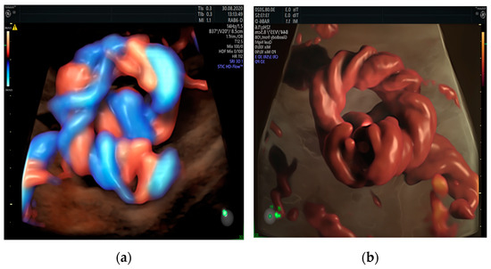 True umbilical cord knot diagnosed at 21 weeks of gestation using spatiotemporal image correlation (STIC) using HD-Flow (a) and “glass-body” mode in iFlow (b).