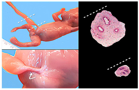 The term “supernumerary vessels” designates more than three vessels in the umbilical cord. The additional vessel may be one artery or one vein. In the case of a supernumerary vein, this vessel derives from the persistence of the right umbilical vein, accompanied by a patent left one. The early venous system appears around the fourth gestational week and is composed of three symmetric paired veins: umbilical, vitelline, and cardinal. Before the sixth week of gestation, the whole right umbilical vein and the proximal segment of the left umbilical vein involute, while there is persistence of the distal part of the left umbilical vein. Failure in regression of the right umbilical vein gives rise to the extra venous vessel [37]. A supernumerary vein has been found to be associated with cleft lip and palate, cardiovascular and gastrointestinal malformations, and fetal hydrops [40]. Embryological development of the umbilical arteries may enlighten the underlying mechanism of the finding of an additional artery in the cord, namely three arteries and one vein. During the third week of gestation, the umbilical arteries emerge as ventral divisions of the paired dorsal aortas. After their fusion, the umbilical arteries fuse with the descending aorta, remaining as two lateral branches in its distal part. Simultaneously, the allantois is surrounded by an arterial plexus that merges in a single artery, lengthening throughout the body stalk. This allantoic artery progressively atrophies as the right and left umbilical arteries grow along the body stalk, and it ultimately unites with the right and left umbilical artery to constitute the interarterial anastomosis at the base of cord insertion. Throughout this process, an additional umbilical artery may result from the failure of fusion of the primitive umbilical arteries with the descending aorta or a deficiency in the coalescence of the arterial plexus to form the allantoic artery. This vessel may also fail to merge with the right and left umbilical artery. Another possibility is the splitting of an umbilical artery during its embryological development [37]. Three arteries and one vein are a highly uncommon combination, and thus the incidence of associated anomalies is difficult to ascertain. It has been described in a stillbirth with no further malformations [41] (Figure 11).