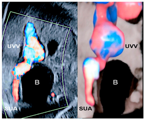 Color Doppler and 3D ultrasound with “glass-body” mode. Absent left umbilical artery. Single umbilical artery (SUA) associated with intra-abdominal umbilical vein varix (UVV) and absence of the ductus venosus. The umbilical vein connects to the inferior vena cava in the suprahepatic area. In the presence of a large varix and bidirectional turbulence flow, the risk of developing a thrombus is higher. (Abbreviation. B: bladder).