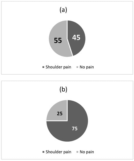 From the questionnaire, 45 out of 61 subjects had suffered from shoulder pain during their swimming activity, 25 occasionally, 20 frequently. In six cases, the pain was still present. The age distribution of those who suffered from shoulder pain showed a clear prevalence in the 36–45 and 46–55 age groups. To better clarify these data, in Figure 2 we can observe that the percentage of shoulder pain in subjects aged between 36 and 45 years of age (Figure 2a), is 45%, while the percentage goes up to 76% in subjects between 46 and 55 (Figure 2b).