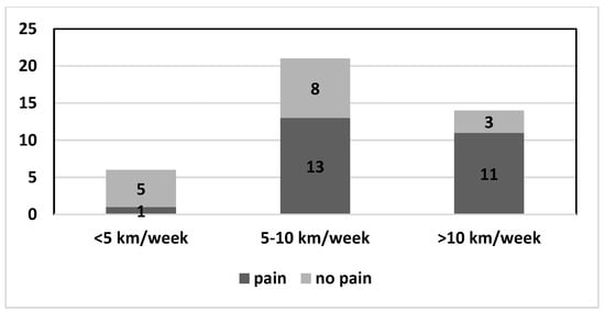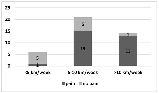 Shoulder pain in dark grey and no pain in light grey on the basis of kilometers performed per week.