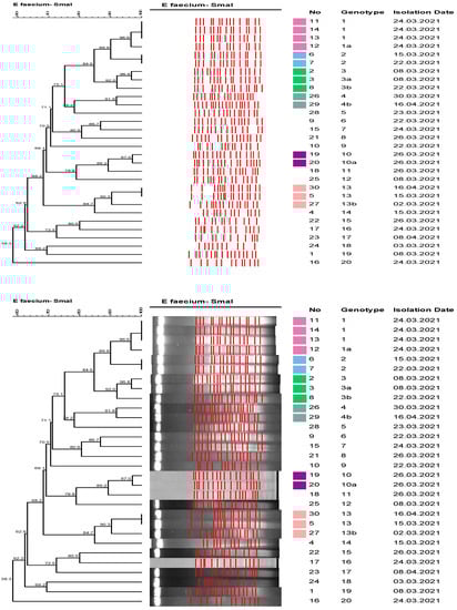 Dendrogram of PFGE Analysis of the VRE Isolates—oncology hospital cluster, 2021 *. * All strains were included in the PFGE analysis.
