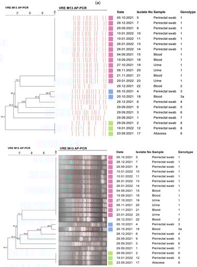 - Karakecılı, F.D.C.B.; Karagoz, A.; Jeffrrıes, M.; Cıkman, A.; Akalın, H.; Ozakın, C. Molecular subtyping of vancomycın resistant enterococcus: A comparison of two molecular methods. Acta Medica Mediterr. 2016, 32, 1797–1803. [Google Scholar]