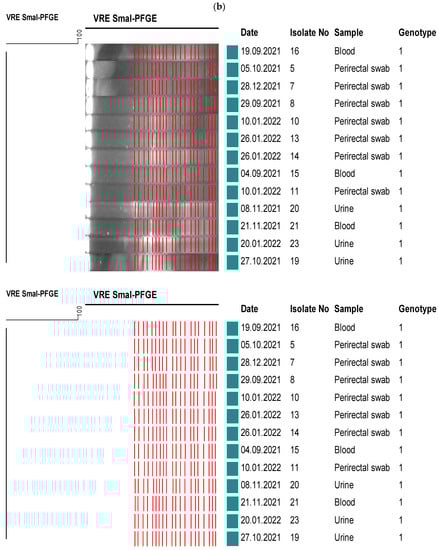Dendrograms of the VRE isolates—medical ICU outbreak, 2022. (a) Dendrogram of AP-PCR analysis. (b) Dendogram of PFGE analysis *. * PFGE was performed for the isolates for which a clonal relationship was determined via AP-PCR analysis.