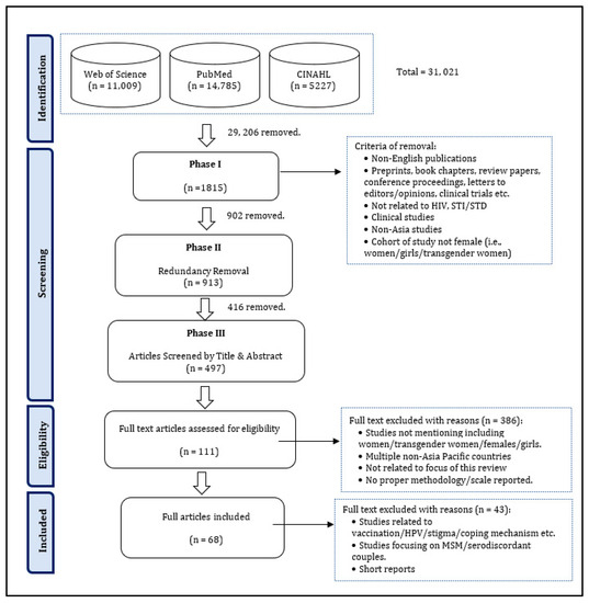 Existing review articles have focused on a single cohort of women, i.e., women living with HIV [9], female sex workers [10,11], and transgender women [12]. Two review studies on knowledge of HIV were conducted by analysing publications from India [13,14], while [15] conducted a review of studies published on cervical cancer screening among women in Africa. Another review [9] looked into the psychological and social impact of women living with HIV in LMIC countries. To the extent that we are aware, no review of the literature on the KAP of women from all cohorts in Asia has been carried out to date, nor has any other kind of literature synthesis been attempted. This review looks to bridge this gap by understanding women’s KAP of STIs/STDs in Asian countries.