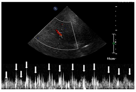The observation window for each scan was set to a duration exceeding 30 s, monitoring the occurrence of HITS within the vessel [24]. The assessment of RLS through the identification of HITS was quantified using the Spencer Grading Scale, a system that includes different grades. Each grade corresponds to a different degree of microbubble identification [25]. In this specific case, HITS were not detectable under resting conditions. However, during the Valsalva stimulation test, the presence of HITS was visually confirmed. A total of 37 instances of HITS were recorded, resulting in a grade 3 classification for the PFO-induced RLS. Consequently, the diagnosis of C-TCCD indicated the presence of an intracardiac short circuit caused by the PFO condition (Figure 5).