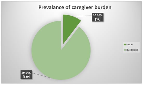 The results showed that 89.64% (n=303) of the caregivers were experiencing caregiver burden, with a mean ZBI score of 41.60 when a cut-off point of <21 was utilized. A majority of the participants were experiencing mild/moderate levels of burden (n = 141, 39.50%), followed by 35.01% (n = 125) that reported moderate/severe levels and 15.13% (n = 54) that experienced severe levels of caregiver burden. Figure 1 below shows the prevalence of the caregiver burden and further illustrates the findings.