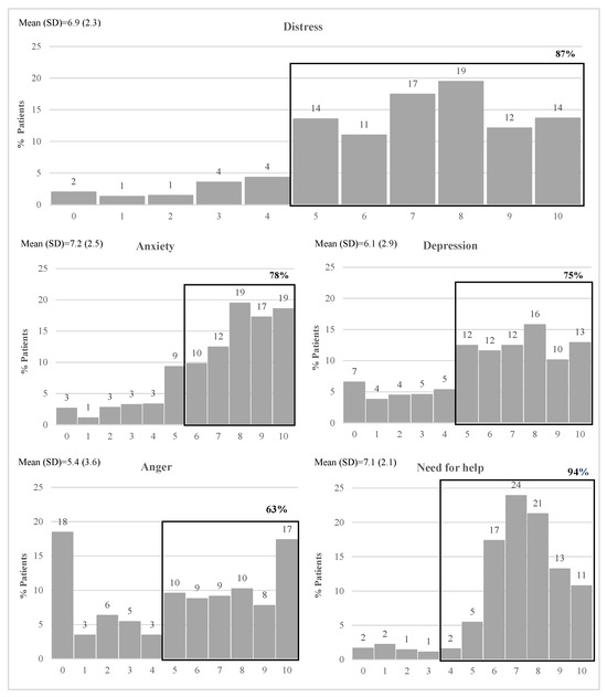 The results show a left-skewed distribution for all ETs, except for anger, with most patients reporting high levels of emotional distress. For the distress thermometer, 87% of patients are above the cut-off (≥5) (Figure 1). The most frequently reported problems were worry (91.9%), sadness (83.9%), fears (80.6%), nervousness (78.4%), fatigue (75.2%), sleep (61.7%), and pain (59.0%) (Figure 2).