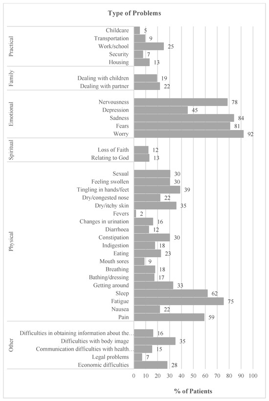 A study has also identified financial concerns, worry, nervousness, difficulties in mobility, and sleep issues as the most frequently reported problems associated with distress, according to the ETs problem list [52]. A study conducted on 3724 cancer patients diagnosed across various tumour locations and with an average age of 58 years revealed that fatigue, sleep disturbances, and mobility issues were the most frequently reported [12]. Other studies have identified emotional problems (worry, nervousness, depression, sadness), insurance-/finance-related problems, and sleep issues as the most common problems reported by cancer patients [53].