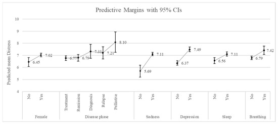 Predicted margins of the generalized linear model, for the relationship between covariates and distress.