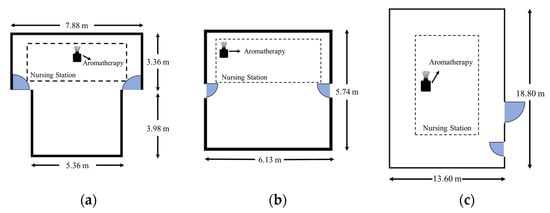Cho and Kwon indicated that aromatherapy by ambient delivery needs a longer time than inhaling to get a positive impact (for a total of 12–24 h) []. In our study, we used a diffuser and conducted aromatherapy consecutively for one month (four work weeks), with interventions made twice every weekday (Monday to Friday) at 08:00–12:00 a.m. and 16:00–20:00 p.m. The scent was 100% pure bergamot peel essential oil produced by AndZen Co., Sydney, Australia, and mainly contained limonene (<46%), linalyl acetate (<35%), and linalool (<23%). An ultrasonic diffuser was used for aroma evaporation (Rose Crown Co., Queensland, Australia), which only diffuses the pure essential molecules without water dilution. For each treatment session, five drops of pure bergamot oil were added, which made the diffuser constantly work for four hours, and the aroma molecules were dispersed into the environment through vibration. The interventions were conducted at the nursing stations of three types of spaces: general and palliative care departments (Figure 1a), ObGyn department (Figure 1b), and ICUs (Figure 1c). The nature of the nursing staff’s work required them to move around the entire space; however, most of their main work was done in the nursing station. Thus, the diffusers were placed at the nursing stations to ensure that all the personnel could experience the intervention. In addition, all the diffusers were placed at the back side of the nursing counter to prevent undesirable effects on patients.