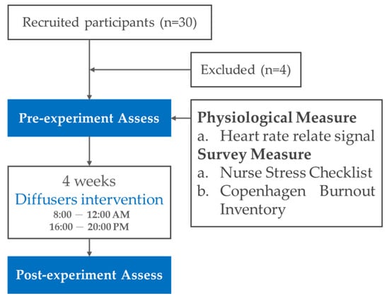 A quasi-experiment was conducted to investigate the effect of bergamot oil on nursing staff. The efficacy of aromatherapy as the experimental intervention was evaluated by collecting the participants’ physiological values and responses to a subjective questionnaire. The overall experimental flow chart is shown in Figure 2. First, pre-experimental records (pre) were made for all the participants one day prior to the intervention. After the completion of four weeks of intervention, the participants’ physiological data were recorded one day after the intervention ended. Participants were also asked to complete a questionnaire. The data were then used for post-experimental evaluation (post).