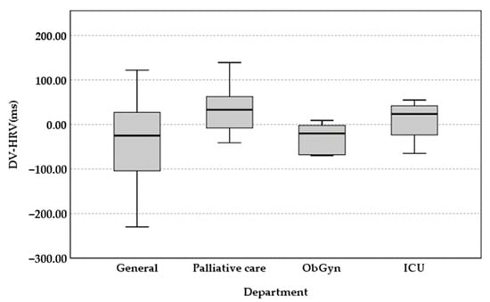 Out of the four different departments of nursing staff, 10 participants were in the general department, seven were in the palliative care department, five were in the ObGyn department, and four were in the ICU. There were no significant changes in SYS, DIA, HR, and HRV before and after the intervention for the four departments. If we compare the nursing staff in four departments, there were increments of mean HRV from the general and ObGyn departments and a reduction from ICU and palliative care departments. The mean increased by 38.1 points in the general department between pre-intervention (M = 98.3, SD = 46.1) and post-intervention (M = 136.4, SD = 104.8), which was the highest increase for the four departments. This indicated that the participants there were more resilient to stress. For the palliative care department, the mean decreased by 27.4 points between pre-intervention (M = 79.7, SD = 48.2) and post-intervention (M = 52.3, SD = 30.5). This reduction was the greatest among the four departments, indicating additional fatigue (Figure 3).
