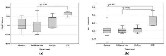 The mean LF (%) has a significant increase of 25.75% (t = −9.69, p < 0.001) in ICU departments. The difference was significant, indicating an increase in the level of stress. Similarly, the mean HF (%) for the ICU participants significantly decreased by 25.75% between pre-intervention (M = 47.5, SD = 9.71) and post-intervention (M = 21.75, SD = 7.93). The mean LF/HF of participants from the ICU increased the most: 3.11 points between pre-intervention (M = 1.17, SD = 0.42) and post-intervention (M = 4.28, SD = 2.59). The difference was of borderline significance (t = −2.75, p < 0.05), which represented greater stress. There was a decrease in the level of relaxation, which was consistent with the analysis of LF%, HF% changes. However, there was no significant difference for the participants from the other three departments. As shown in Figure 4, the results of the one-way ANOVA analysis showed that the changes in LF% (p < 0.05), HF% (p < 0.05), and LF/HF (p < 0.05) were significantly different amount four departments. A large Cohen’s effect was found for LF% (d = 0.818), HF% (d = 0.818), and Ratio (d = 0.822) indicators in four groups of nursing departments. Post-hoc analysis using Tukey confirmed that the pre- and post-experimental changes in LF%, HF% from the ICU were significantly greater than the palliative care department (M = −31.03, p < 0.05). For LF/HF ratio, the largest changes were seen in the ICU participants. The larger the ratio, the greater the regulation by the sympathetic nervous system. Therefore, the poor effect of aromatherapy by bergamot oil was found to alleviate the symptoms of physical stress when nursing staff faces heavy workload.