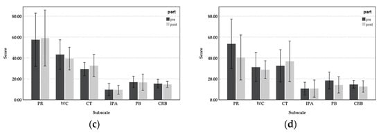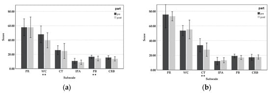 Subscale scores of NSC and CBI pre-post intervention: (a) General department; (b) Palliative care department; (c) ObGyn department; and (d) ICU (** p < 0.01).